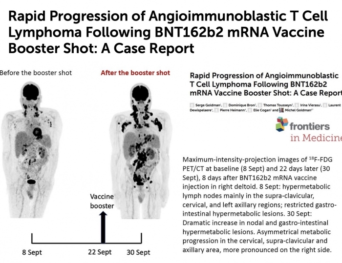 This observation, which has been posted as a pre-print on the SSRN platform (18), suggests that vaccination with the BNT162b2 mRNA vaccine might induce rapid progression of AITL. Dedicated studies are needed to determine whether this case can be extrapolated to populations of patients with AITL or other peripheral T cell lymphoma involving TFH cells.